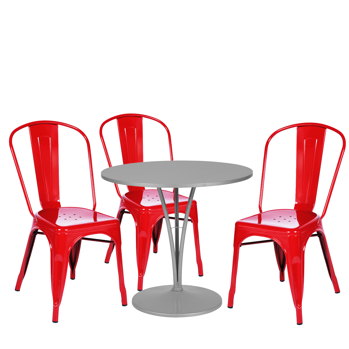 Composition : 1 table TRILOGIE Ø80 blanche + 3 chaises TONIC rouges vif.